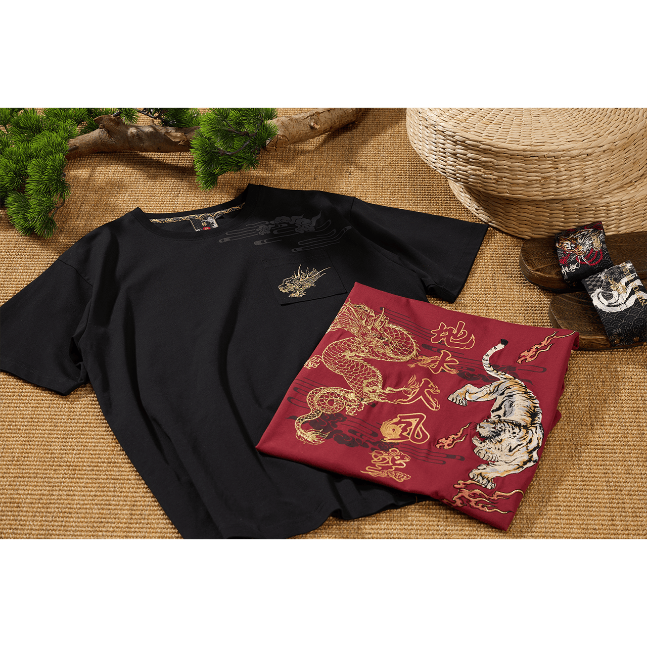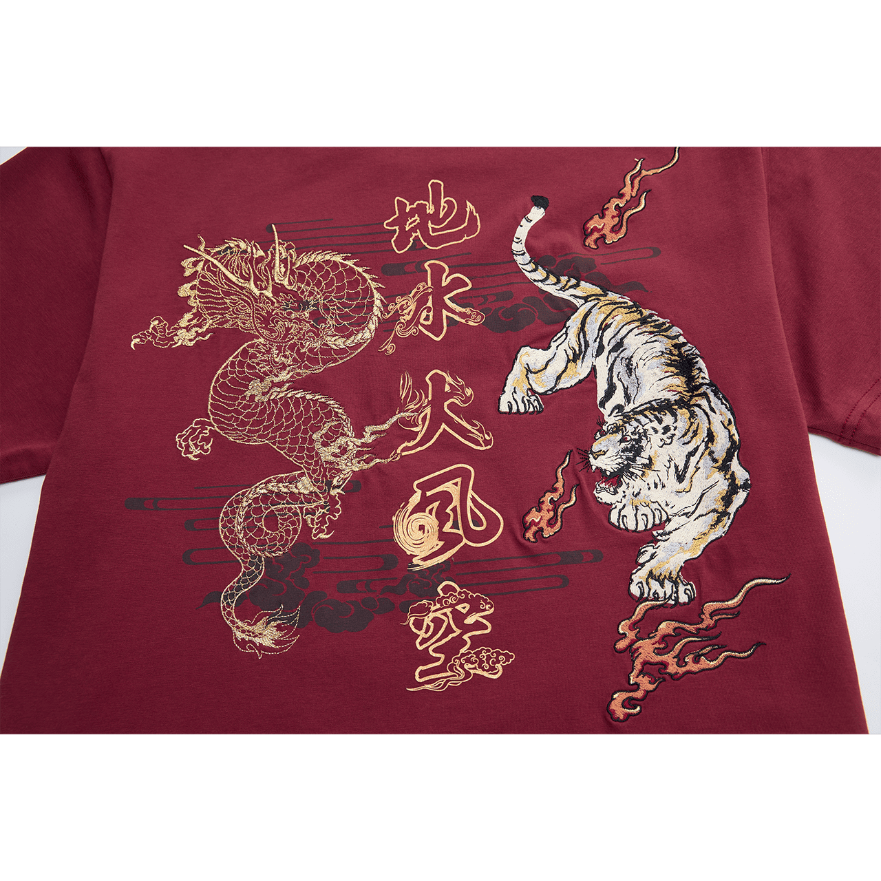 「赤」は情熱・活力・吉兆を象徴。《火の巻》は幸運の訪れを表す一枚。 龍と虎が背面に共存し、力強さと前向きなエネルギーを表現。