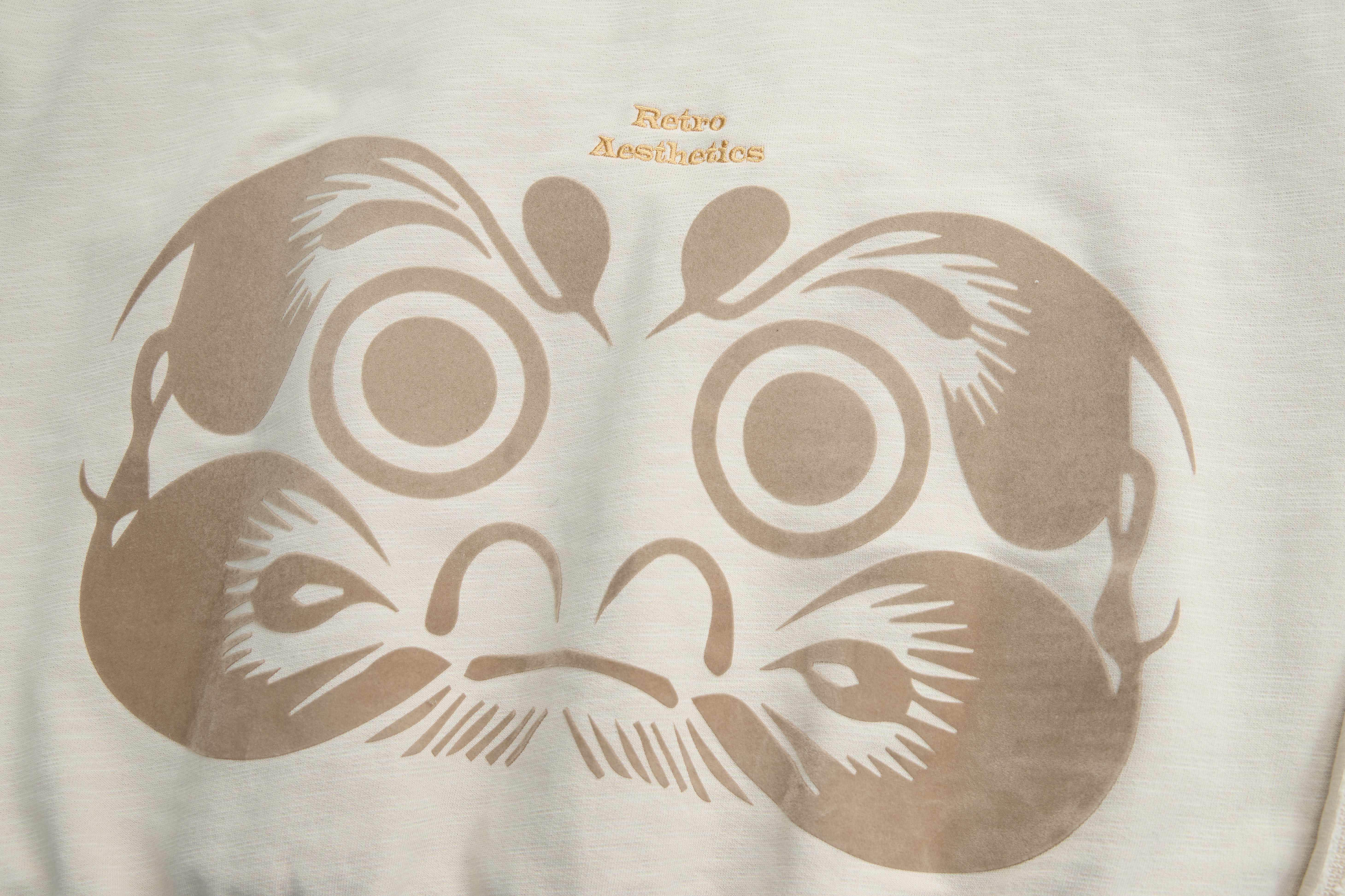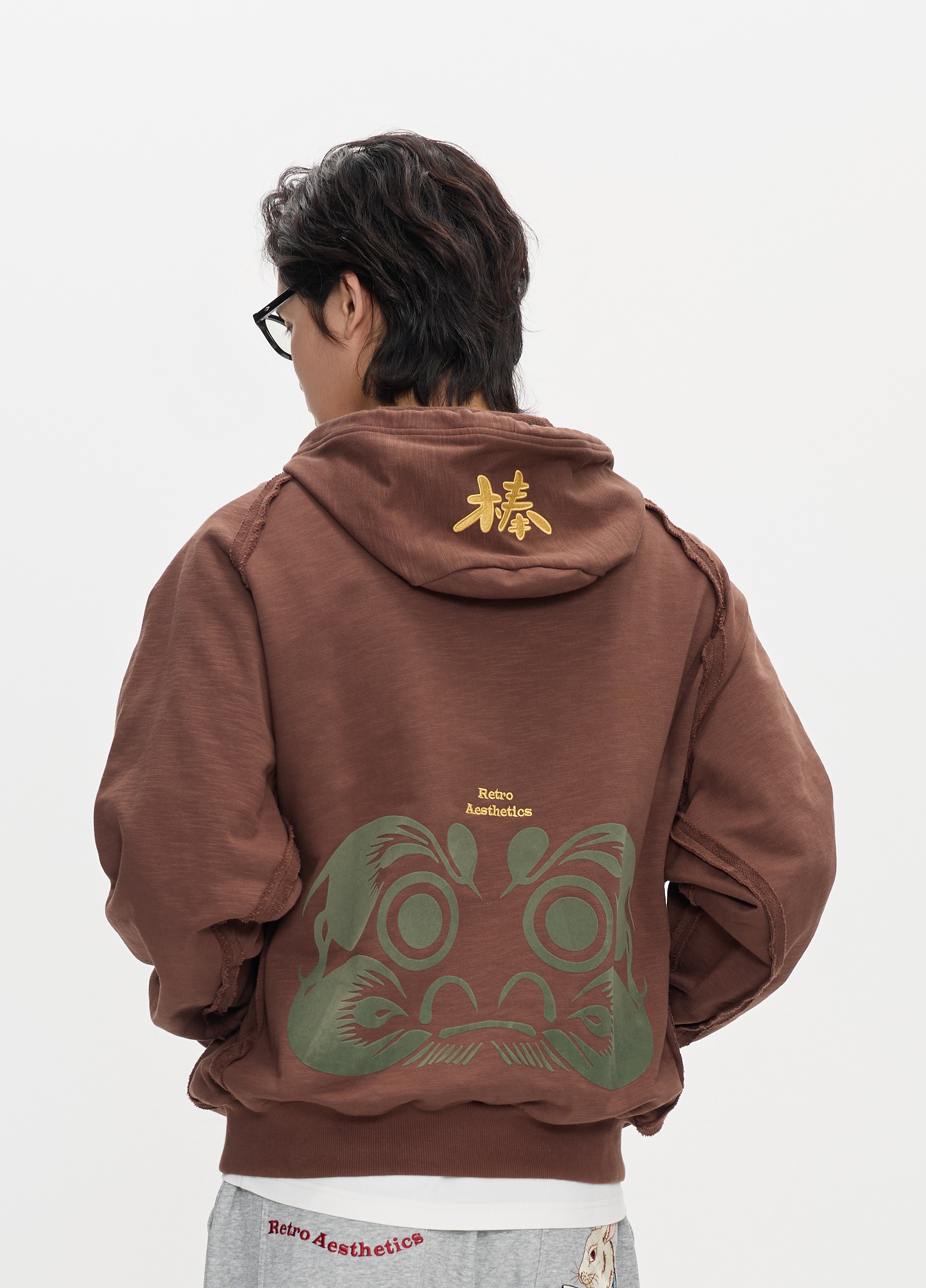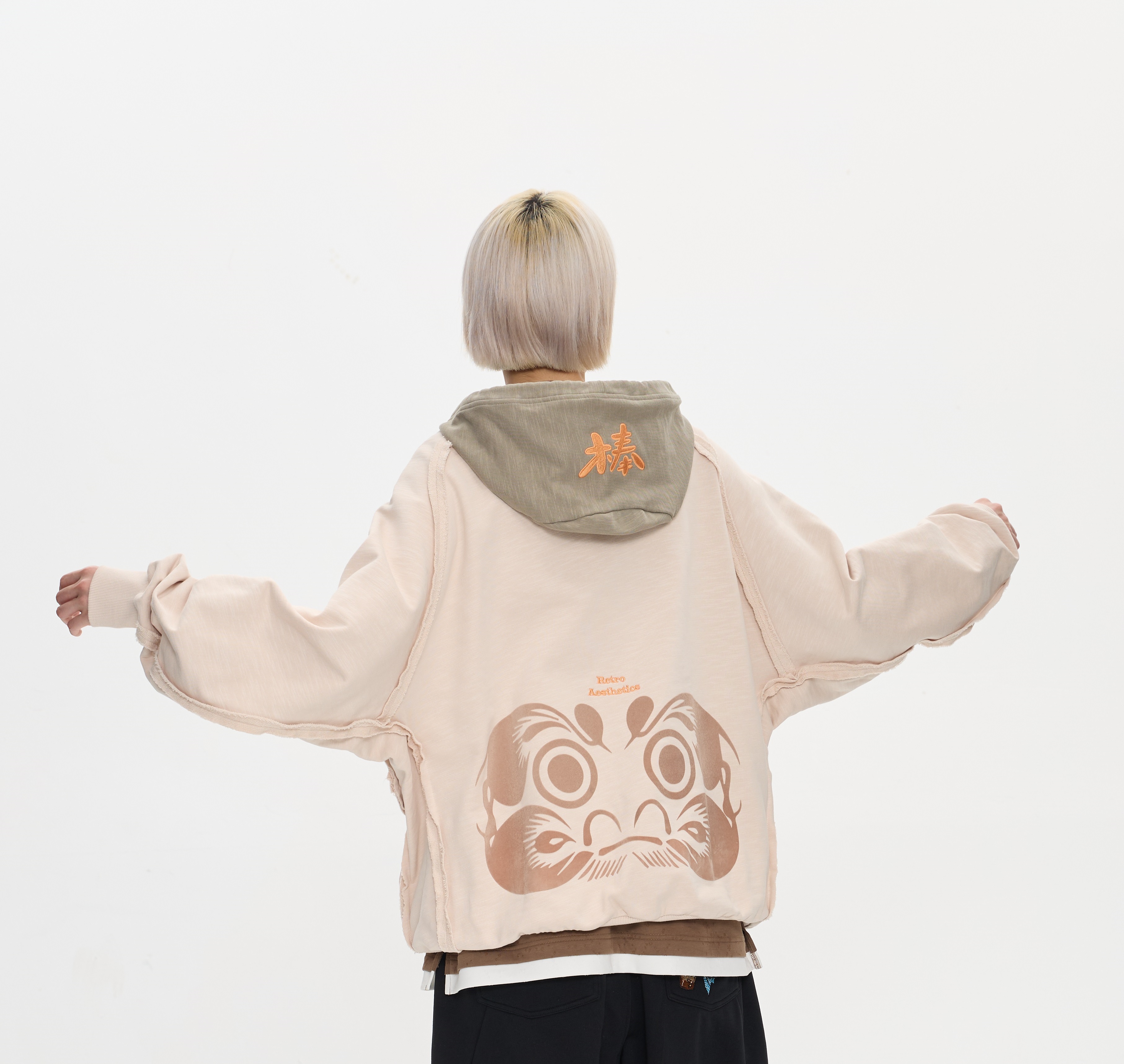 背面に大胆な達磨フェイスを配置した刺繍パーカー。フロッキープリントと刺繍を組み合わせ、奥行きのある仕上がりに。竹節調の風合いある生地とゆったりしたシルエットで、リラックス感のある着心地を楽しめます。