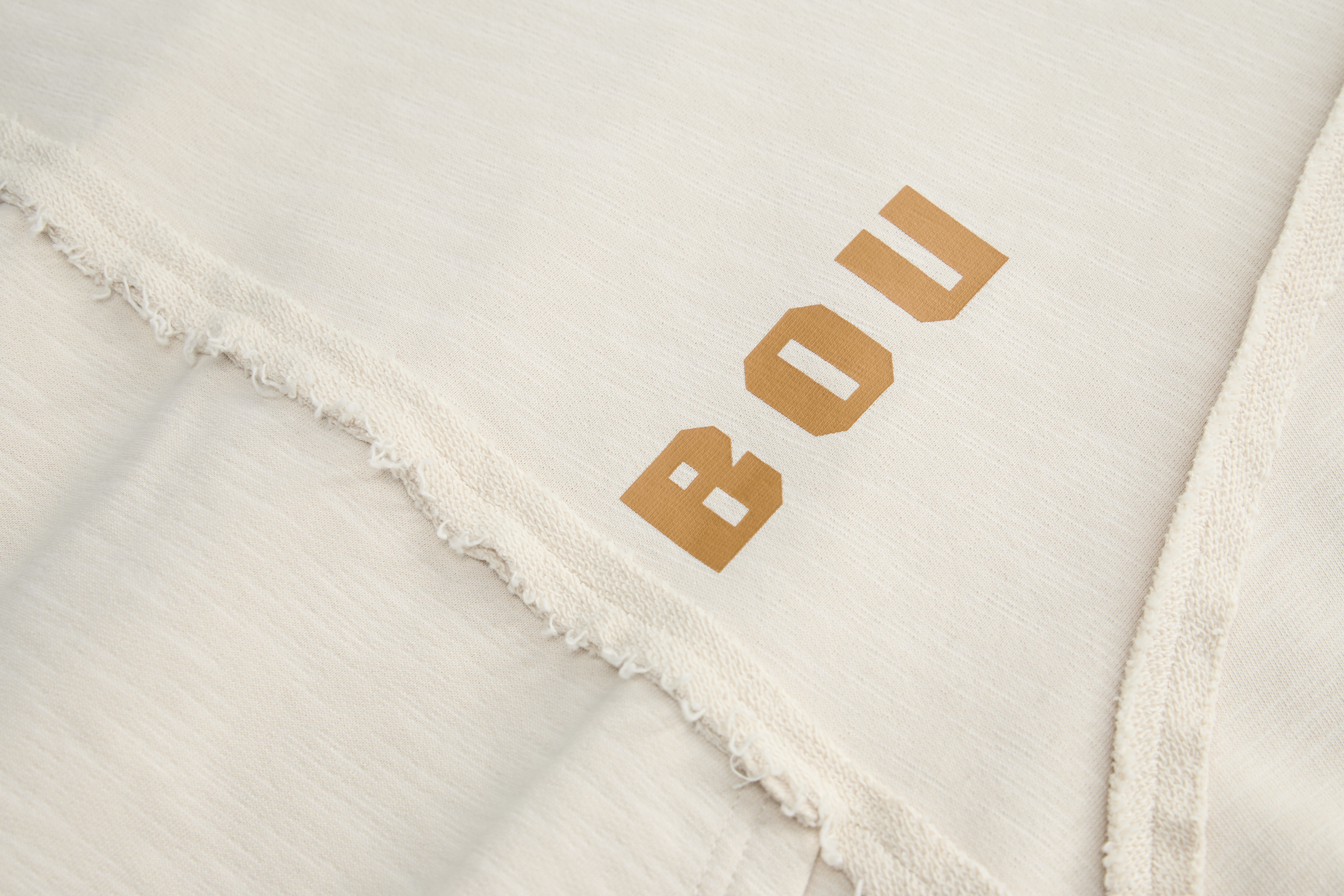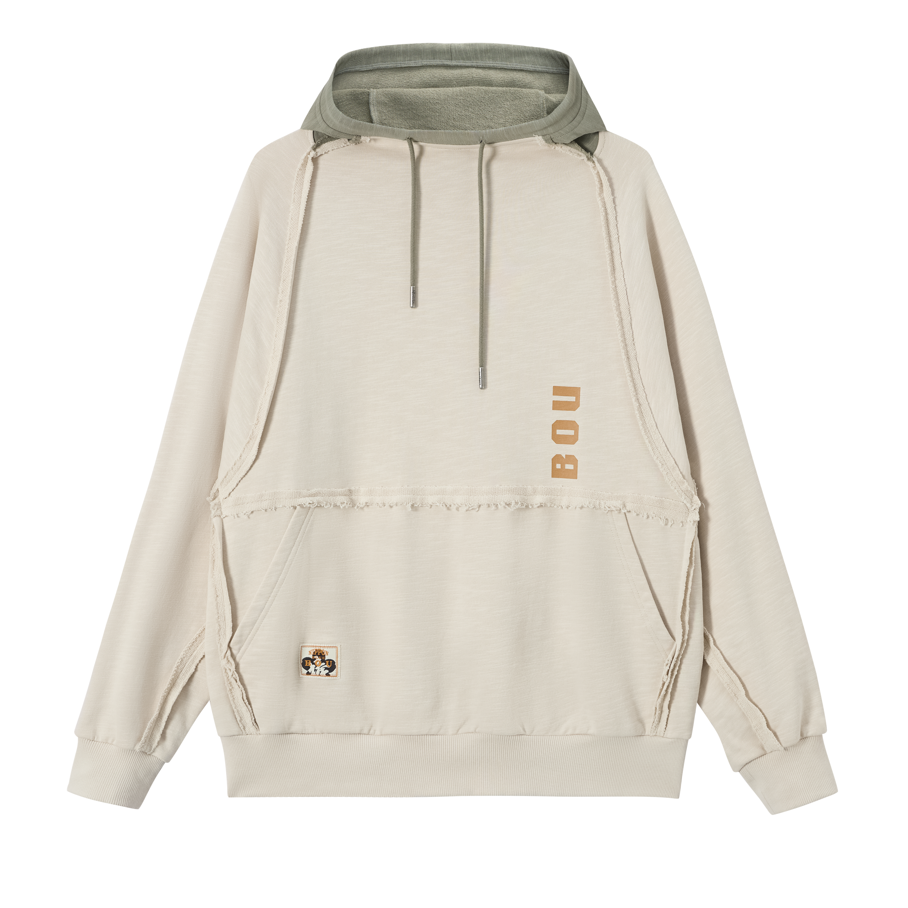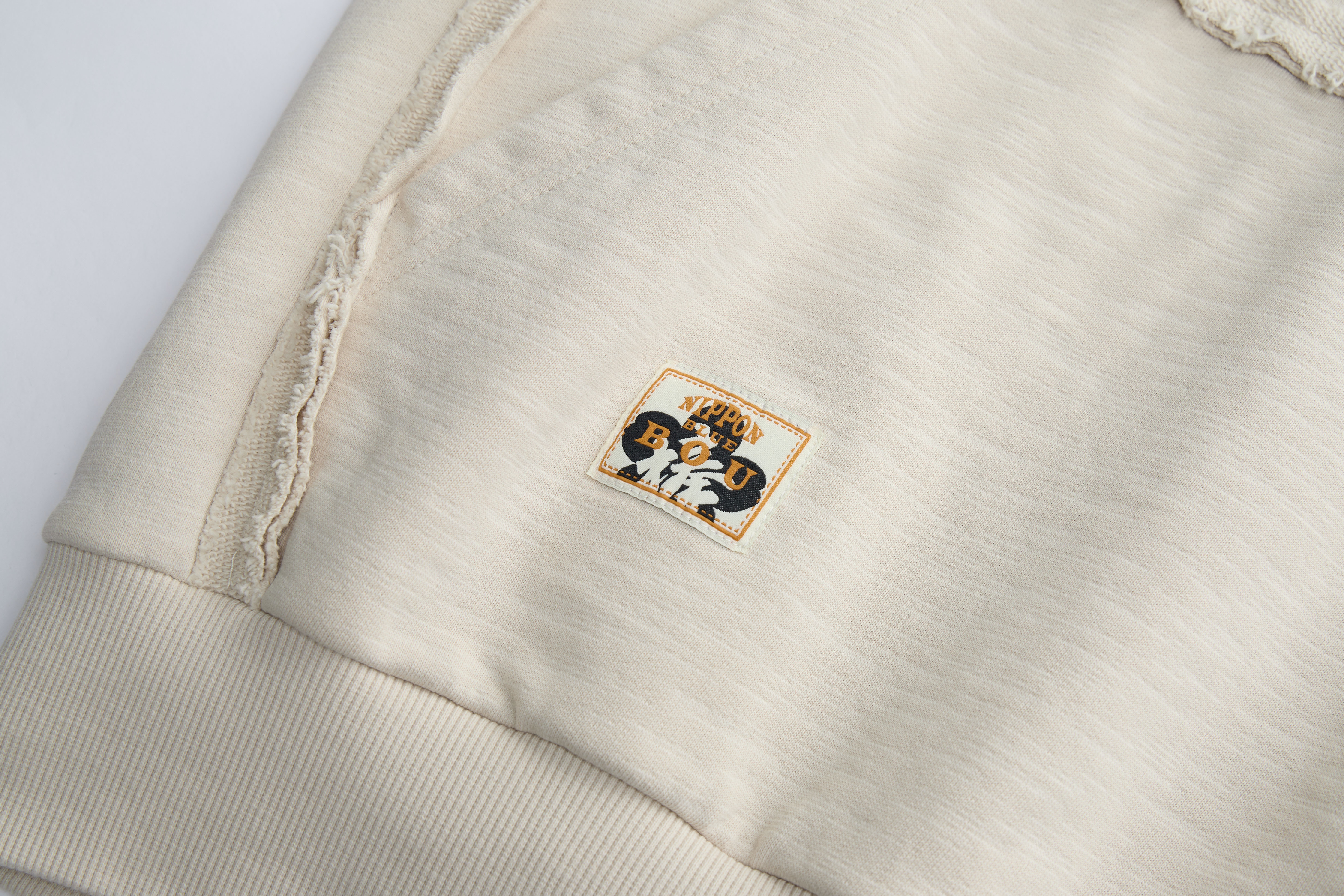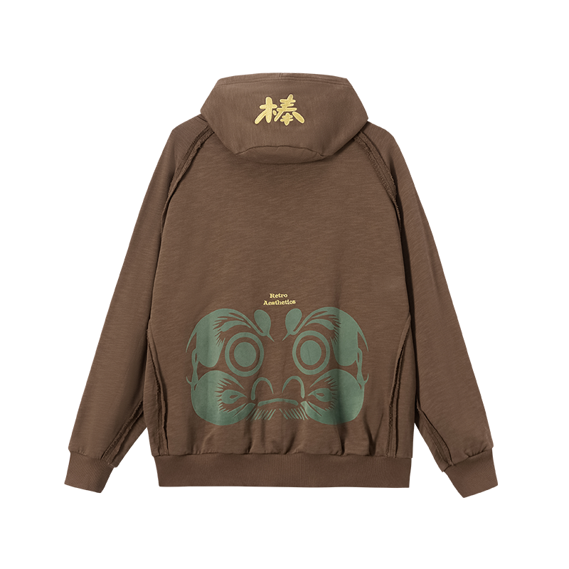 背面に大胆な達磨フェイスを配置した刺繍パーカー。フロッキープリントと刺繍を組み合わせ、奥行きのある仕上がりに。竹節調の風合いある生地とゆったりしたシルエットで、リラックス感のある着心地を楽しめます。